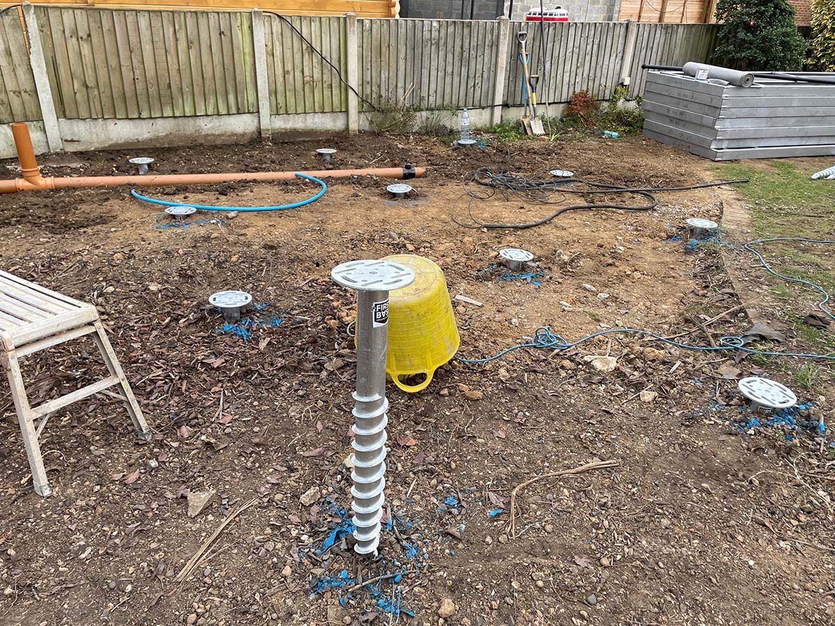 There are several factors that determine the type and number of ground screws you require. These include the weight of the finished structure, the size and type of joists or supports it uses and the type of terrain and soil you are building on. Here you can assses your projects needs and get an estimate for installing a ground screw foundation.